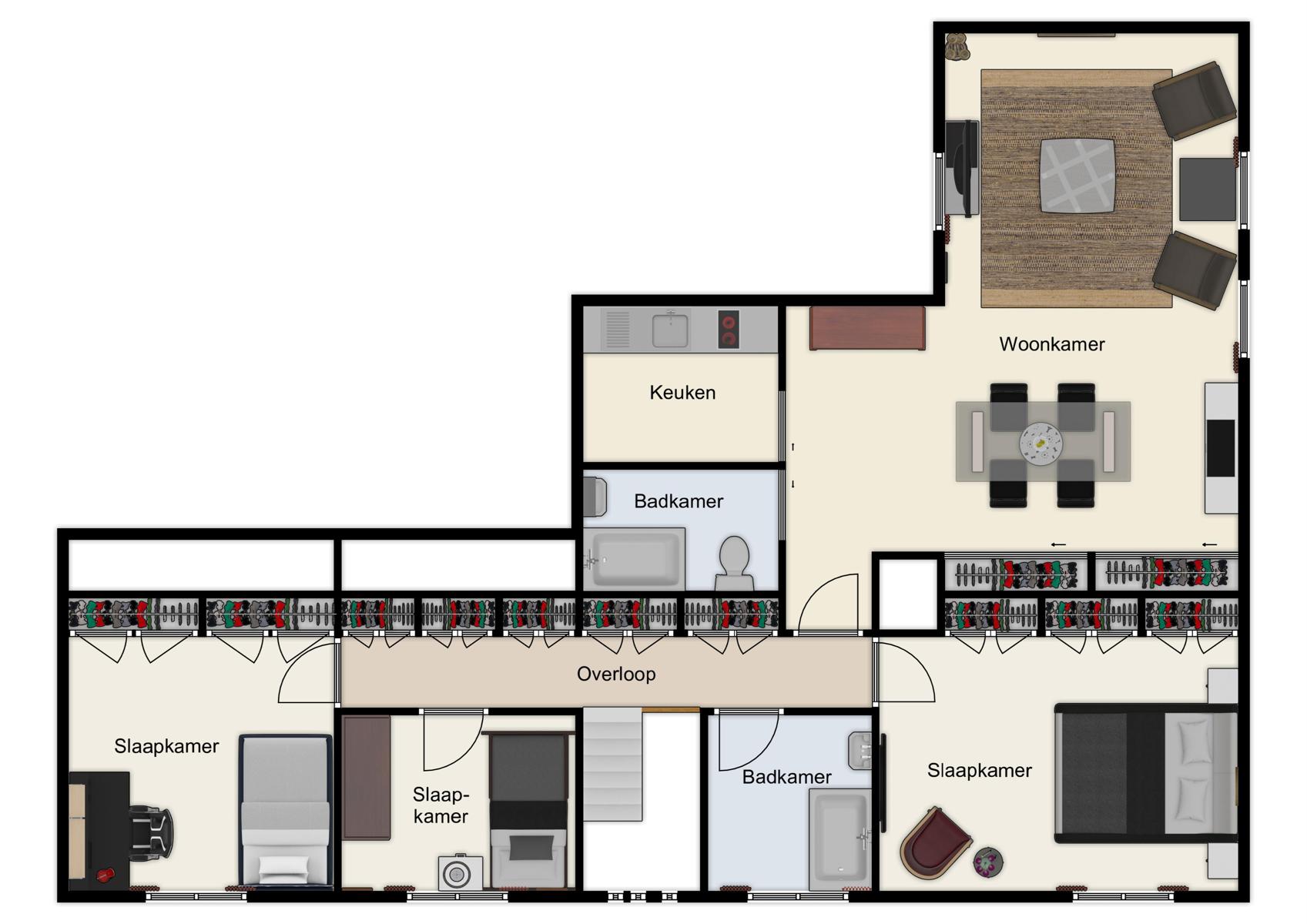 Op de eerste verdieping vinden we 4 slaapkamers, waarvan 1 met een eigen badkamer en kitchenette. Verder is er nog een badkamer nabij de nachthal.
