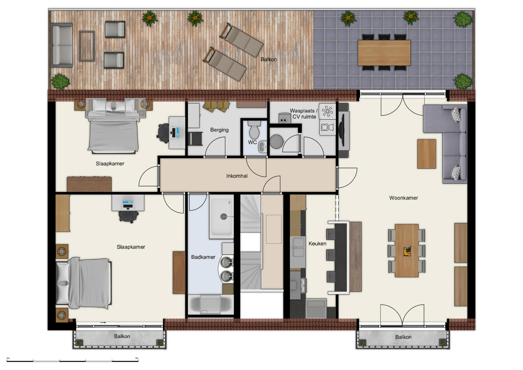 Ruim dakappartement met 2 slaapkamers, groot terras en garage.