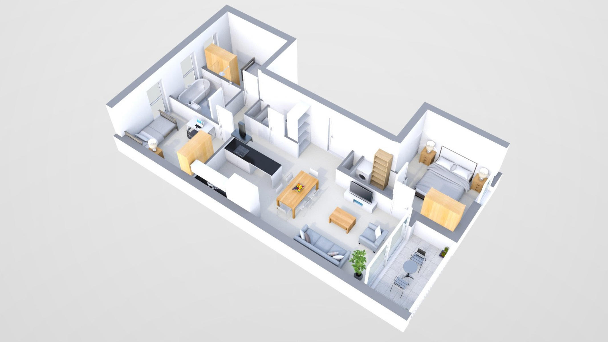 Het appartement heeft een open inkomhal met lichtrijke leefruimte en open keuken.