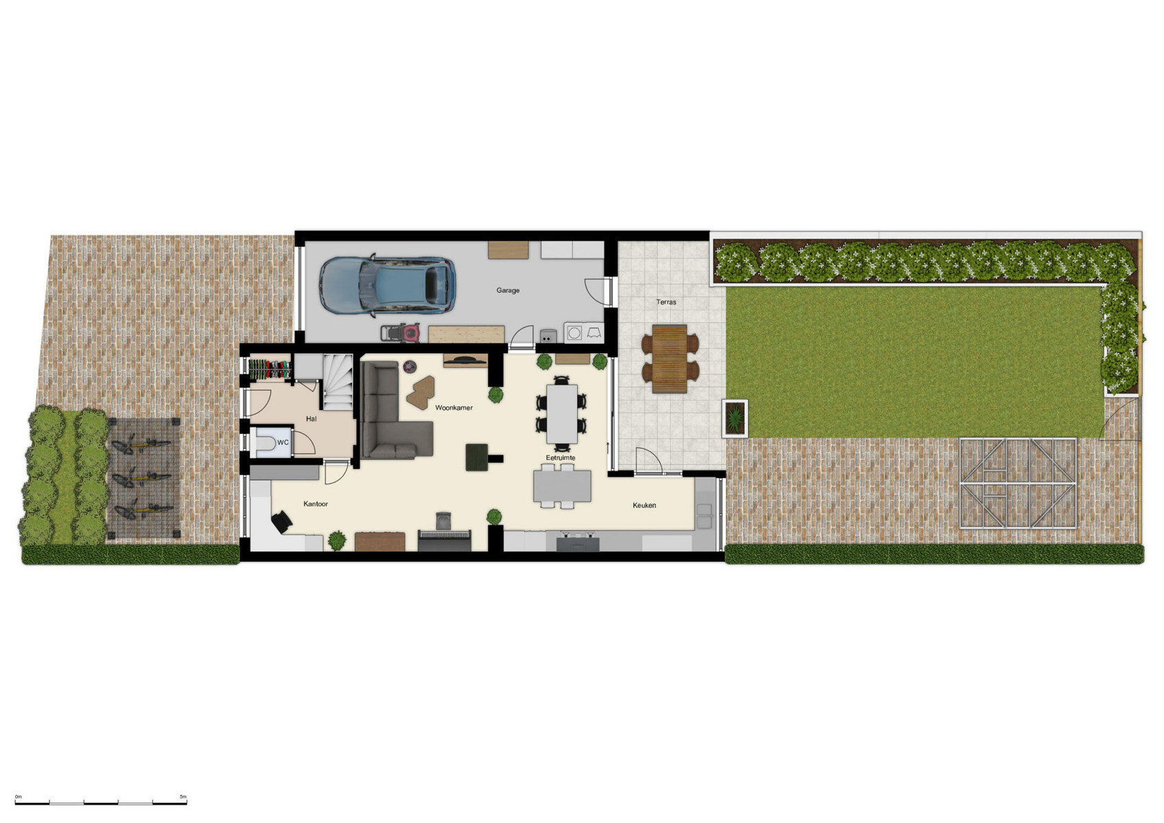 De ruime garage strekt zich uit van de voorkant tot de achterkant van de woning en biedt voldoende plaats voor je auto, fietsen en een handige wasplaats. Ontsnappen via de tuin, te voet of met de fiets? Het kan allemaal!