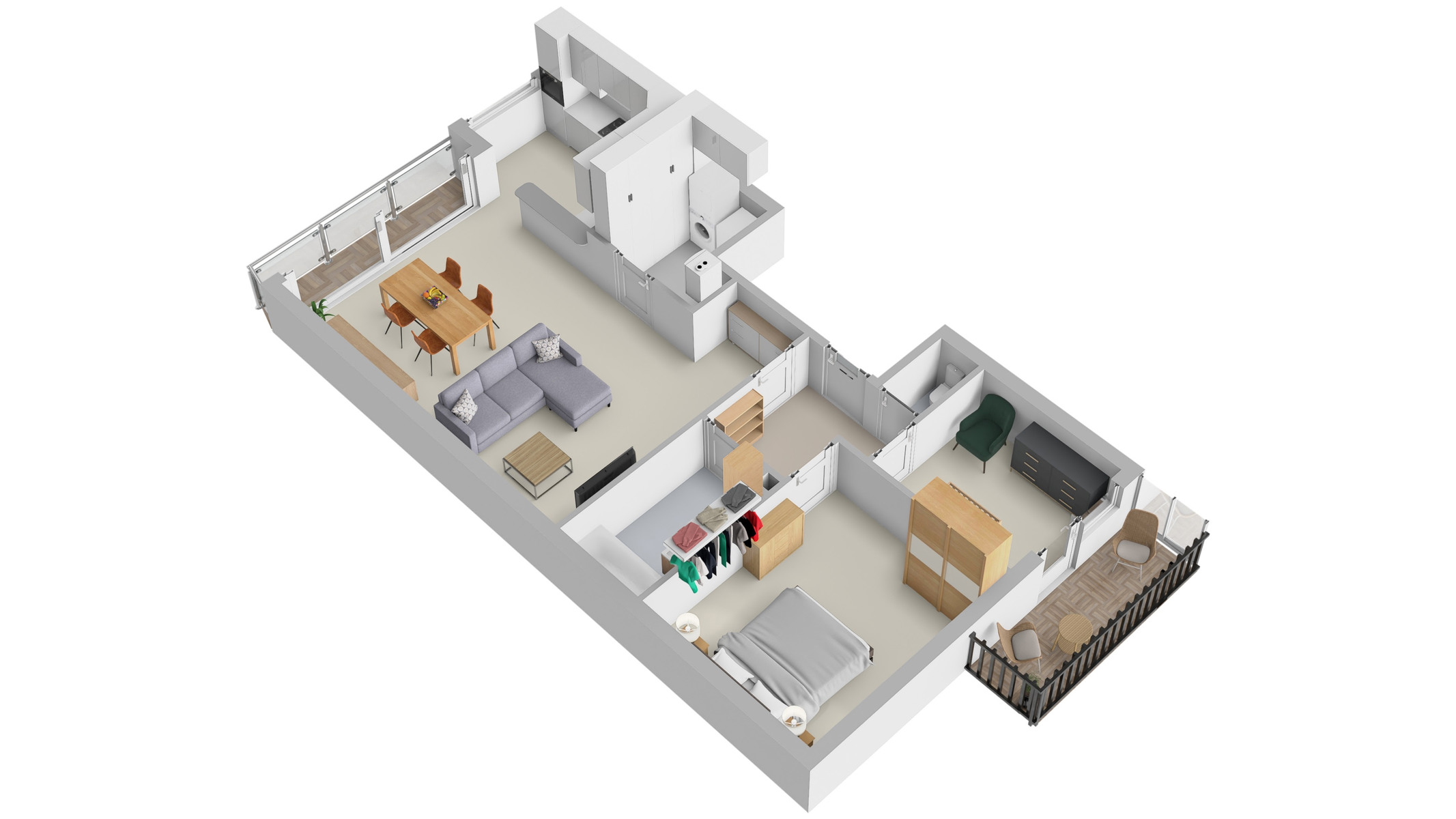 Bij binnenkomst word je verwelkomd in de inkomhal, die naadloos aansluit op alle ruimtes. De ruime en zonnige leefruimte op parket geeft toegang tot een zonnig balkon. De open keuken is volledig uitgerust met moderne apparatuur en biedt alle comfort. Daarnaast is er een handige berging met aansluitingen voor een wasmachine en droogkast.