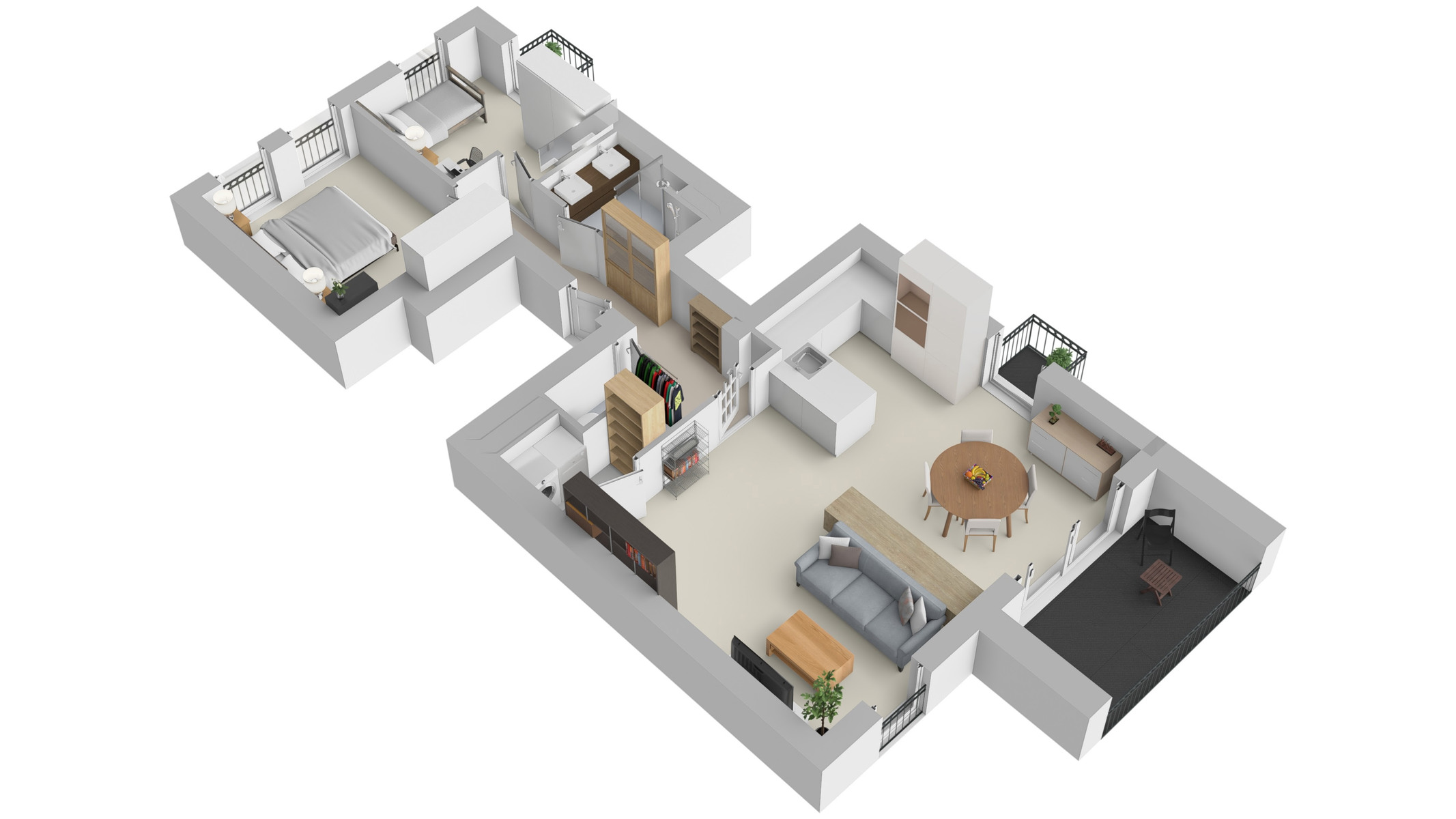 Het appartement beschikt over twee volwaardige slaapkamers, een moderne badkamer met inloopdouche en dubbele wastafel, en een aparte technische berging die extra comfort en praktische opbergruimte biedt.