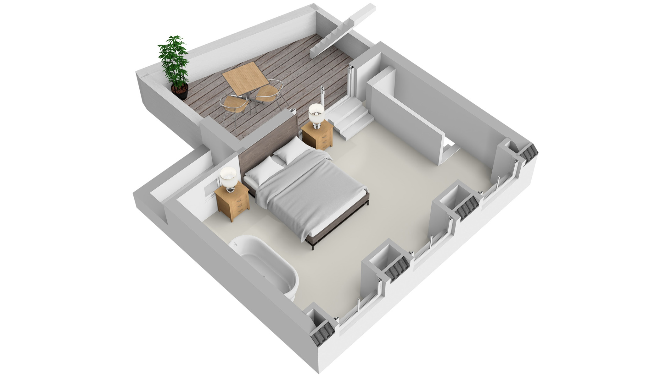 Op het gelijkvloers liggen de woonkamer en de open, ingerichte keuken. Daarboven volgen twee volwaardige verdiepingen. Op elk van deze niveaus is er een slaapkamer en een badkamer, wat het wonen comfortabel en praktisch maakt. De hoogste verdieping is de meest recente toevoeging en geeft rechtstreeks toegang tot het terras. Via deze laag bereik je het dakterras waar je geniet van open zicht en avondzon over de hele stad.