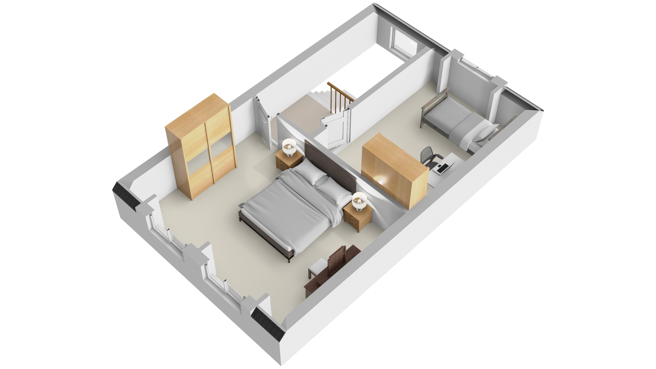 Op de eerste verdieping bevinden zich twee volwaardige slaapkamers en dankzij de oppervlakte biedt deze verdieping de mogelijkheid om hier een badkamer te creëren, wat het wooncomfort aanzienlijk kan verhogen.